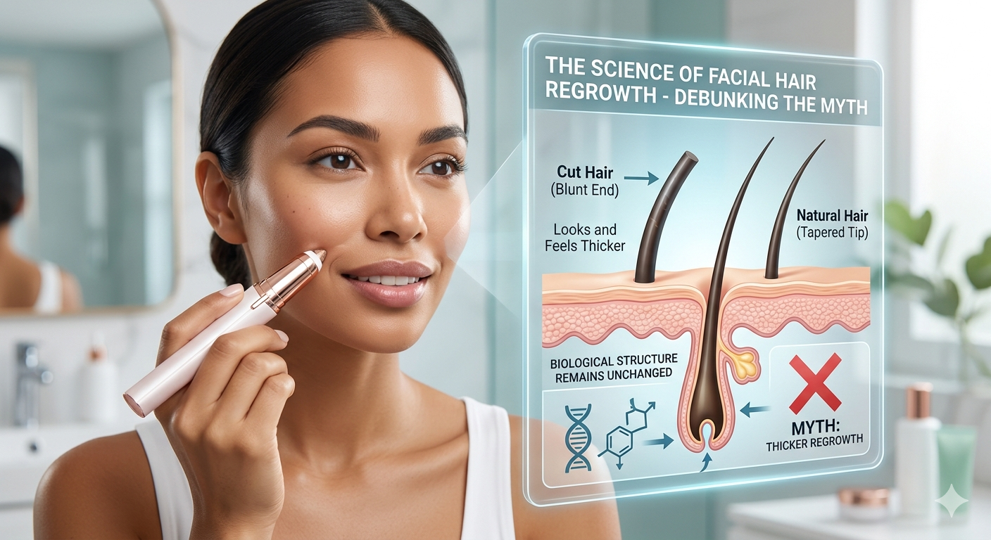 El grosor del cabello y la tasa de crecimiento están determinados exclusivamente por factores genéticos y hormonales y no por métodos de eliminación externos. Cada cabello humano crece a partir de un folículo profundo dentro de la capa de la dermis de la piel. Cuando usas un removedor de vello facial , estás cortando el cabello en la superficie o sacándolo desde la raíz. Ninguna de estas acciones se comunica con el bulbo del folículo para producir una hebra más gruesa. El folículo sigue un ciclo predeterminado: anágeno (crecimiento), catágeno (transición) y telógeno (reposo), que está regulado por señales internas como andrógenos y suministro de sangre.
